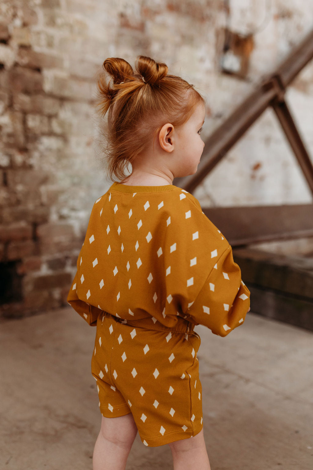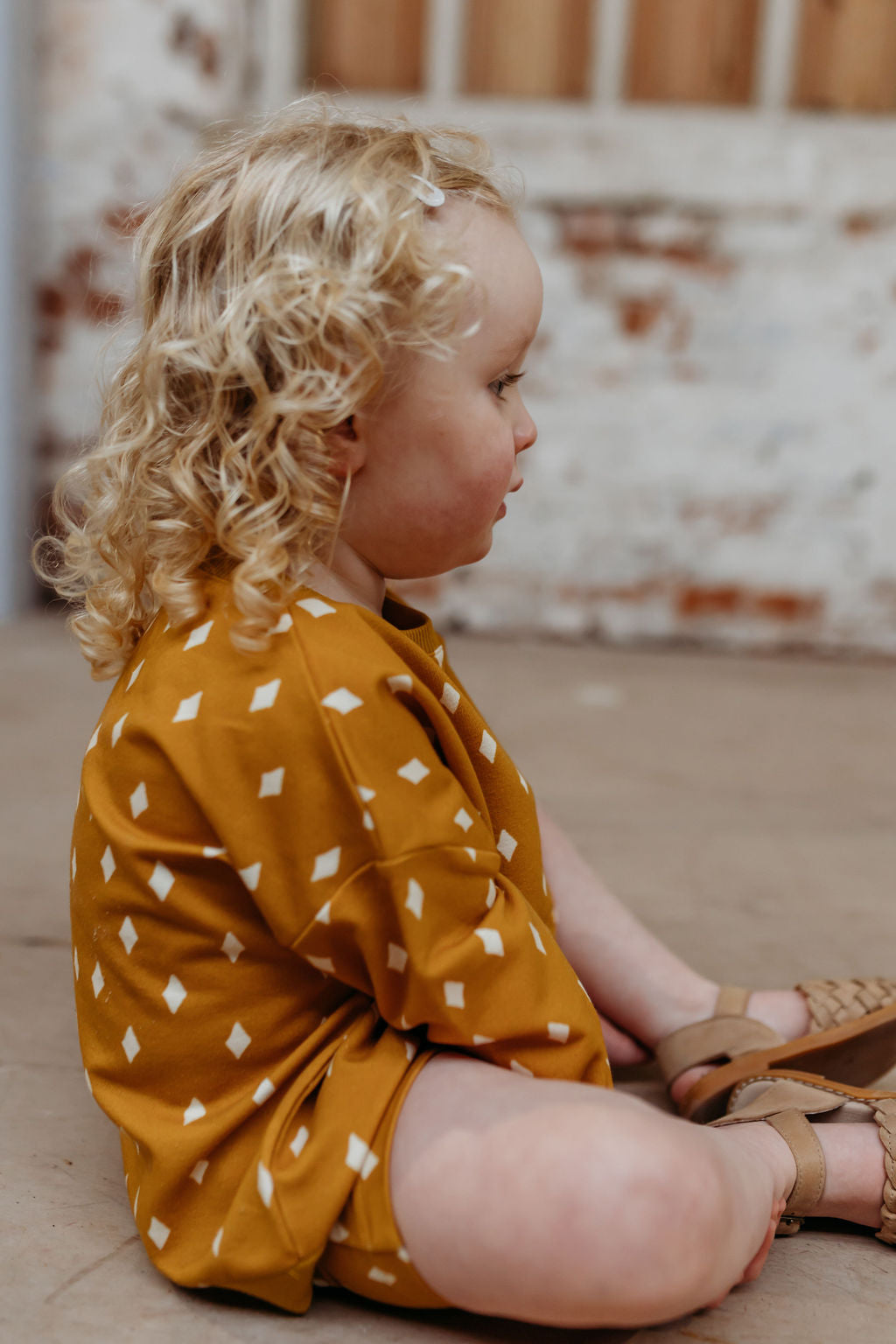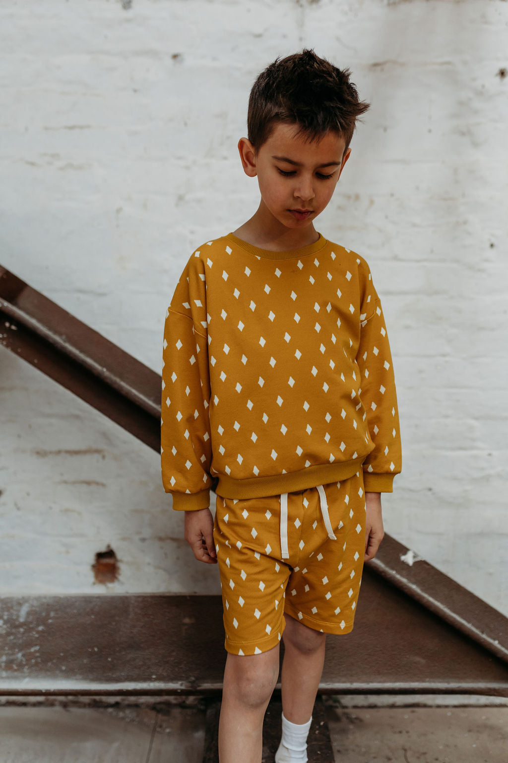 A key print in our new collection, out Diamond Scatter Sweatshirt features our signature neutral ecru print set against a warm ochre background. The sweat is designed with an oversized fit, in a medium-weight organic cotton, perfect for cooler summer days and evenings, with enough room for layering in the colder winter months. It features dropped shoulders and soft cotton ribbed trims, with snap buttons on the neck for 6-12 months and 1-2 years. Matching shorts available.